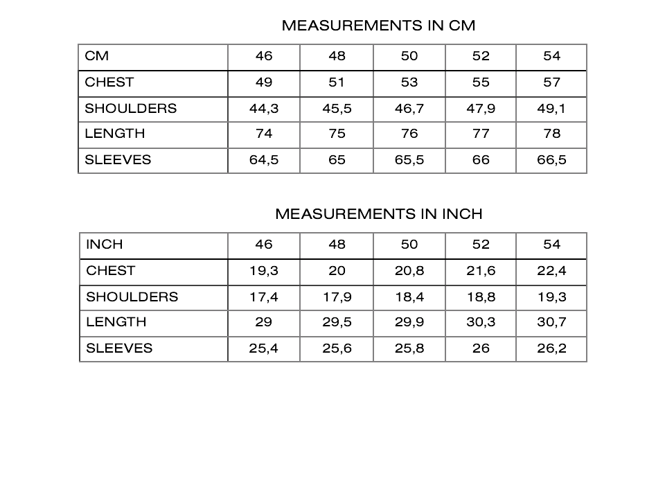 SIZINGMeasurements are taken flat. Each garments measurements can vary due to traditionnal craftmanship. JACKETS & BLAZERS SHIRTING TSHIRTS SWEATERS TROUSERS